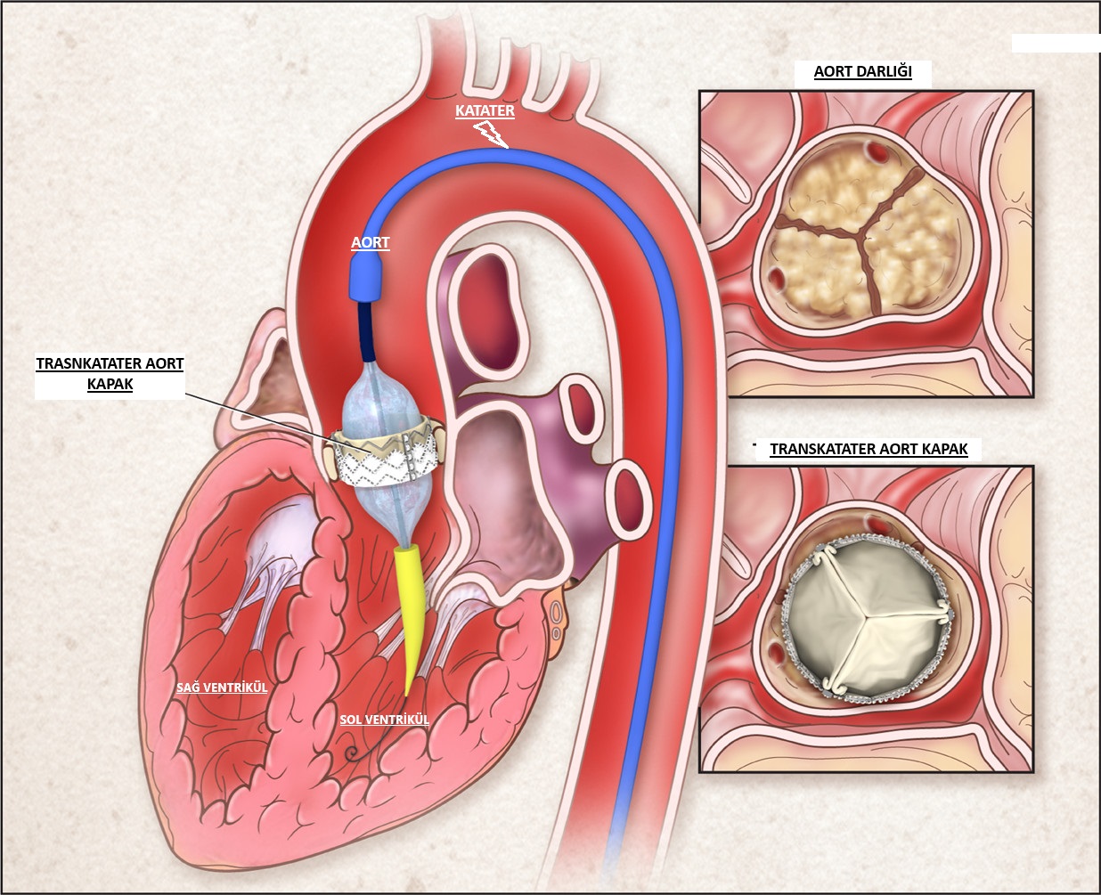 TAVI genellikle derin sedasyon ya da genel anestezi ile yapılan – kasıktaki atardamardan küçük bir kesi ile yapılan ağrısız bir işlemdir. Koroner anjiyografi veya stent işleminden kullanılan kateterlere benzeyen dar ve esnek bir tüp (katater)kasıkta bulunan atardamarınıza yerleştirilir ve kalbinizdeki aort kapağınıza ulaşılır. Bu kateter esnekliğini yitirmiş ve kireçli eski kapağınızın üstüne yedek bir kapak takmak için kullanılır. Bu katerterden geçen sistem ile ameliyata gerek kalmadan yeni biyoprotez kapak eskimiş kapağın üzerine yerleştirilir.